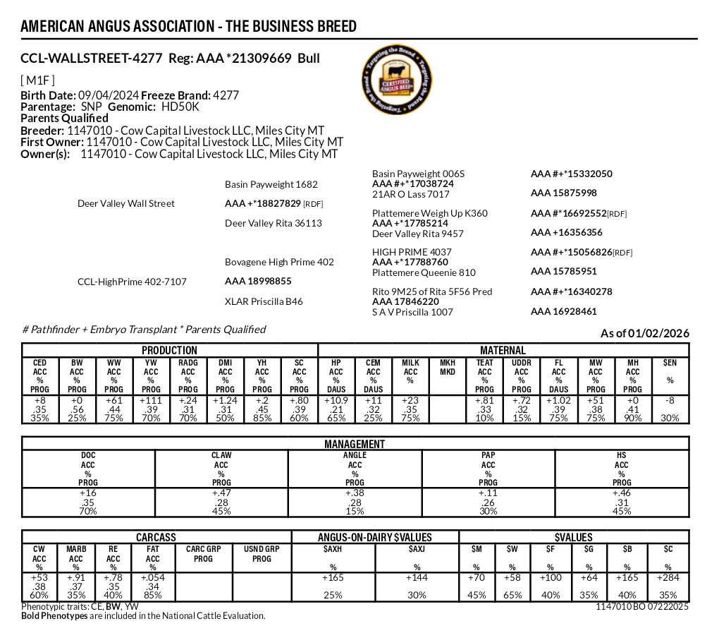 Wall Street was a flush brother to Growth Fund and this 7107 cow has raised some good offspring for us, both bulls and heifers. Another set of EPD’s that would be perfect for some coming three year olds.